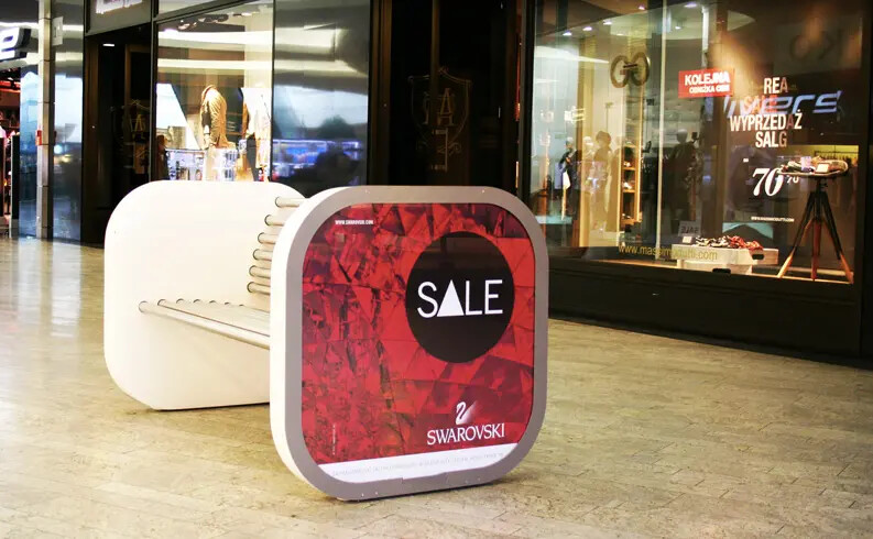 W całej galerii znajduje się 28 ławek z 56 ekranami reklamowymi o wymiarach 80 × 80 cm każdy. Nasze ławki znajdują się w głównych punktach interakcji (touch points) klientów z reklamą – przy wejściach do budynku, na placach wewnątrz galerii, skrzyżowaniach i alejach handlowych – słowem wszędzie tam, gdzie klienci zatrzymują się na dłużej.